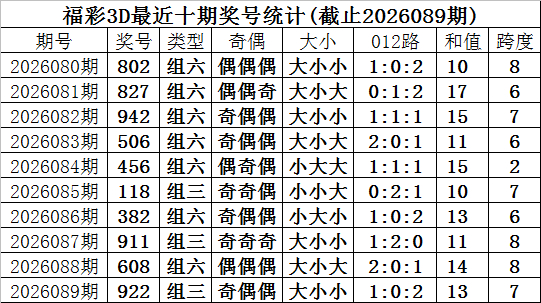 开奖回顾:福彩3D第2026089期奖号为922,奖号形态为:组三、大小小、1:0:2、奇偶偶。